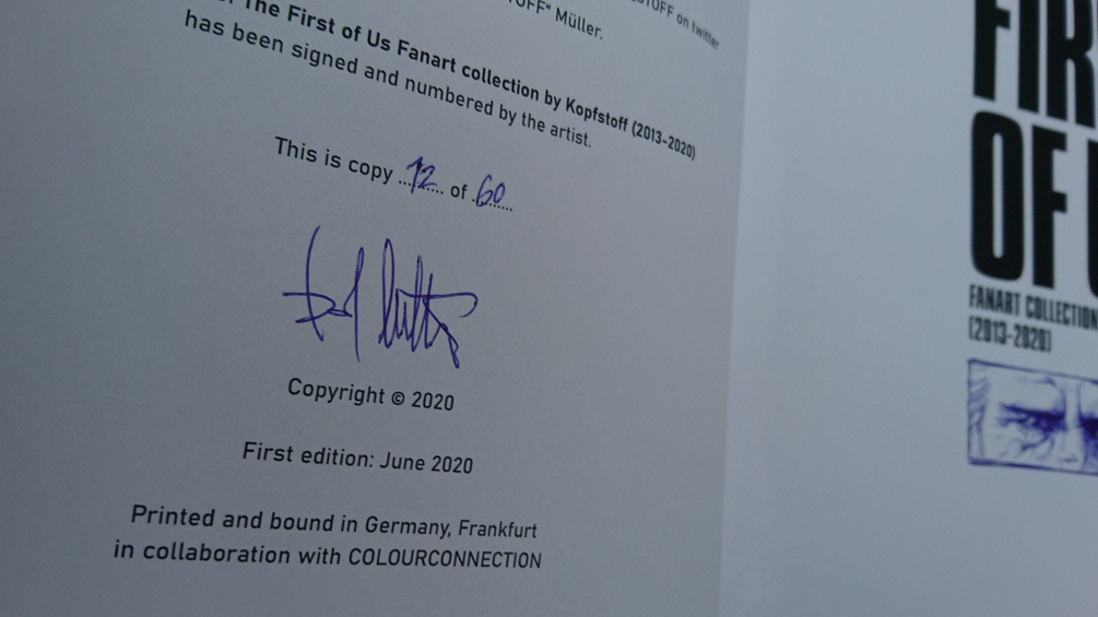 First DIN A4 softcover edition, strictly limitedto 60 handnumbered & signed copies with the first 20 having a small ballpen sketch inside. 56 pages filled with every fanart I ever did between 2013 and 2020.